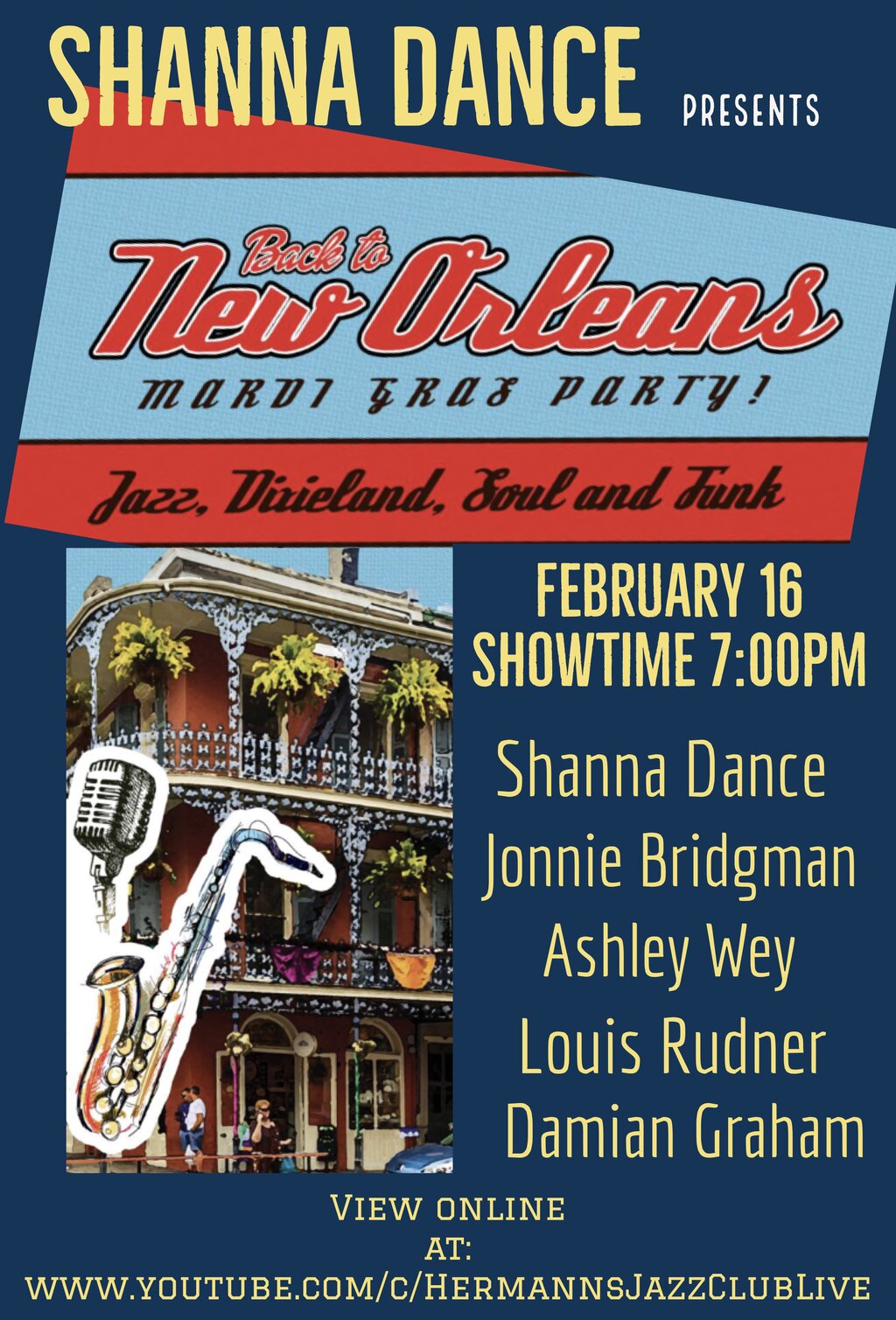 Tue. February 16th 2021 7:00 pm - 8:30 pm (All Ages) Shanna is back at Hermann's with a dynamite band for another tribute to the music of New Orleans with a Mardi Gras punch! You'll hear New Orleans Classics in the style of Louis Armstrong, Dr. John, Professor Longhair, Aaron Neville, the Meters, Jon Cleary and more! A night of music, fun, and soulful singing!
