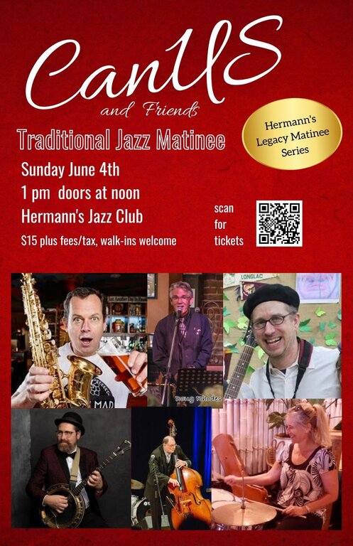A “SPECIAL EVENT” is now scheduled for the CanUS Jazz Band on June 4th 1-3 pm at Hermann’s Jazz Club. Two CanUS musicians will be out of town: Toni Blodgett and Alfons Fear are away (not together tho’, ha.)