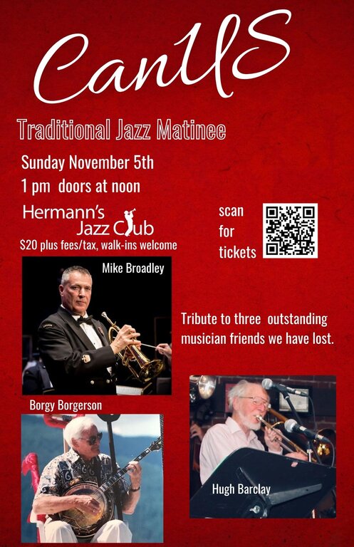 Today is a special day for CanUS, paying tribute to three outstanding musicians who are, one would hope, making music in another heavenly place. Mike Broadley, former CanUS trumpet player & singer as well as with Naden and so many other groups; Hugh Barclay, trombonist with popular Dixieland Express Jazz Band, and famous Borgy Borgerson, a “Hall of Fame” banjo player also most recent locally was also with Dixieland Express. They were well known to the fans of New Orleans jazz. and over the years created a jolly musical interaction that comes with mutual respect and years of sharing the love of this unique genre. They are sorely missed and lovingly remembered. Our internationally renown CanUS Jazz Band has world class musicians who move here to Victoria(usually thanks to a lovely Canadian love-mate). Newest to the group are Simon Stribling, former leader of Australia’s "Fireworks Jazz Band” and his mate, now our drummer, Lauri Lyster. They travelled world-wide & now living in Victoria . He joins local heroes of classic jazz, Al Pease, clarinet, Doug Rhodes, saxophone, Avram McCagherty, banjo, Joey Smith bass, and Toni Blodgett, band leader & tickling the ivories.